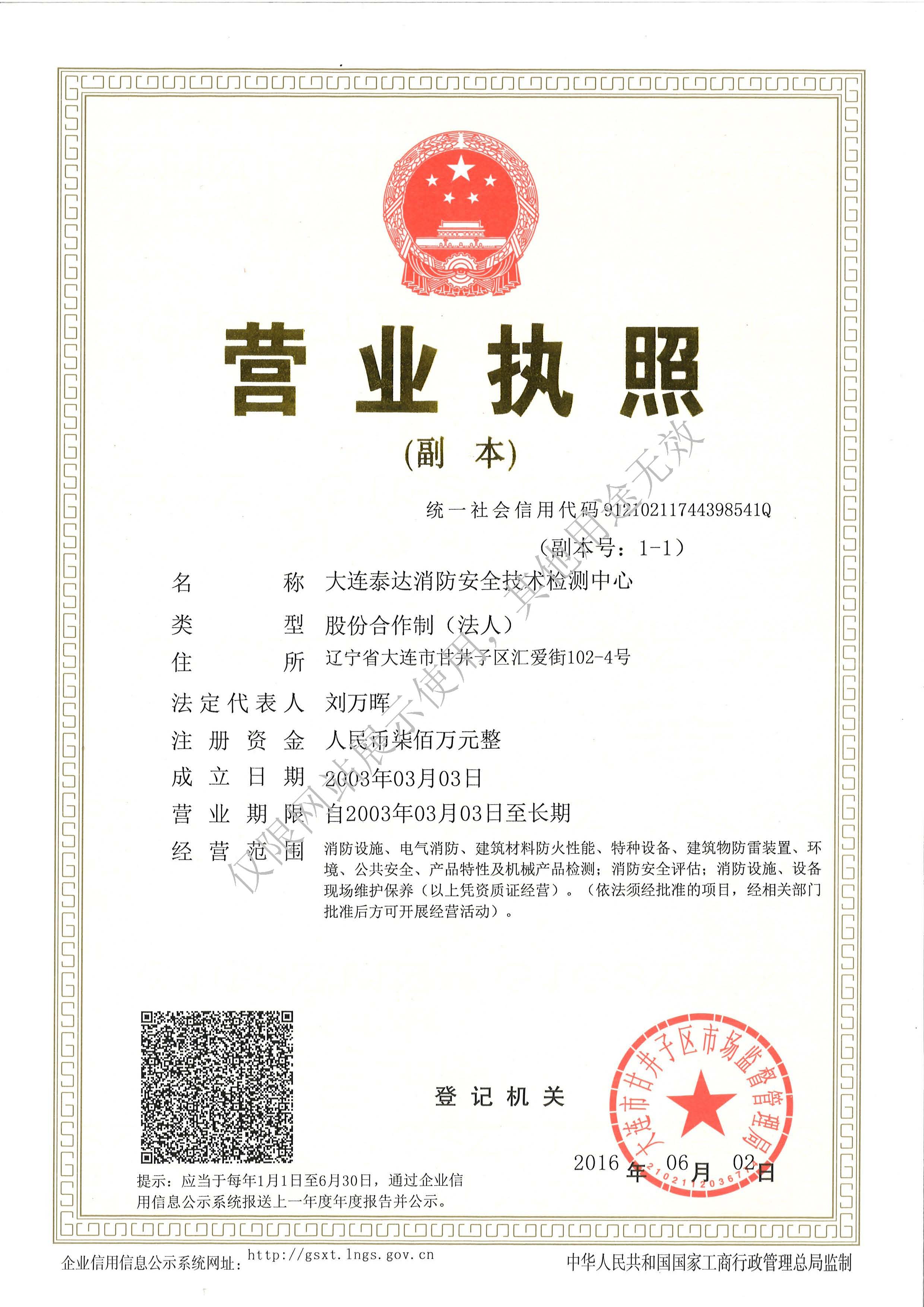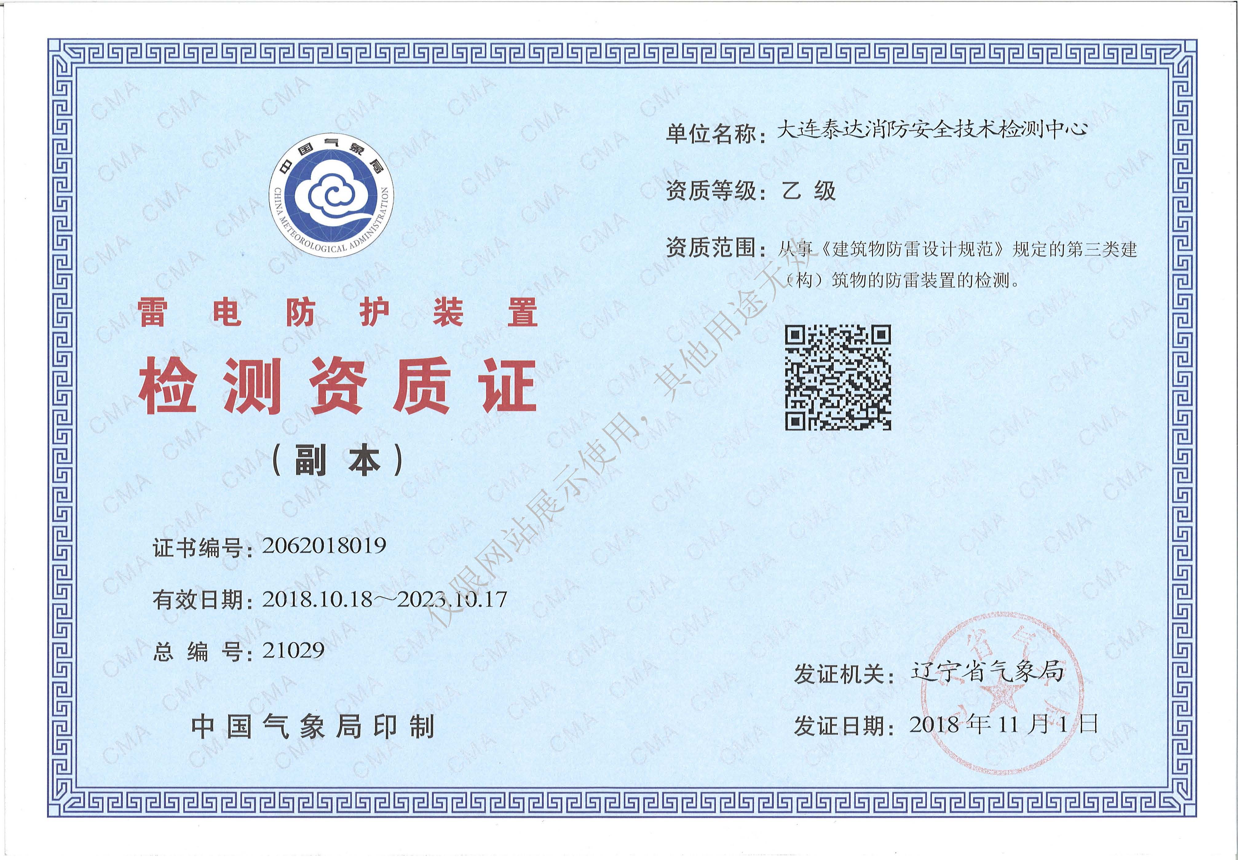 · 是經“社會消防技術服務信息系統”備案并公示的消防技術服務機構,已取得中國氣象局頒發(fā)的雷電防護裝置檢測資質證書、遼寧省質量技術監(jiān)督局審核批準的檢驗檢測機構資質認定證書(CMA)及包括消防檢測、電氣檢測、雷電防護裝置檢測、防火涂層厚度檢測等在內的200余項檢驗檢測能力,取得大連市應急管理局頒發(fā)的安全生產標準化證書,獲得質量管理體系、環(huán)境管理體系、職業(yè)健康安全管理體系認證證書,是經備案的高新技術企業(yè),可獨立出具具有證明作用的檢測報告。